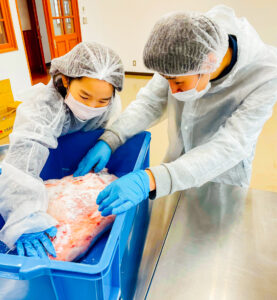 豚肉をカッティング除去をして 発酵熟成の妨げになる余肉や脂身を取り除きます。