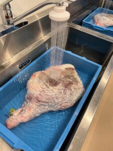 トリミングされた骨付き肉は計量され、血抜き、塩すりの工程に入ります。
